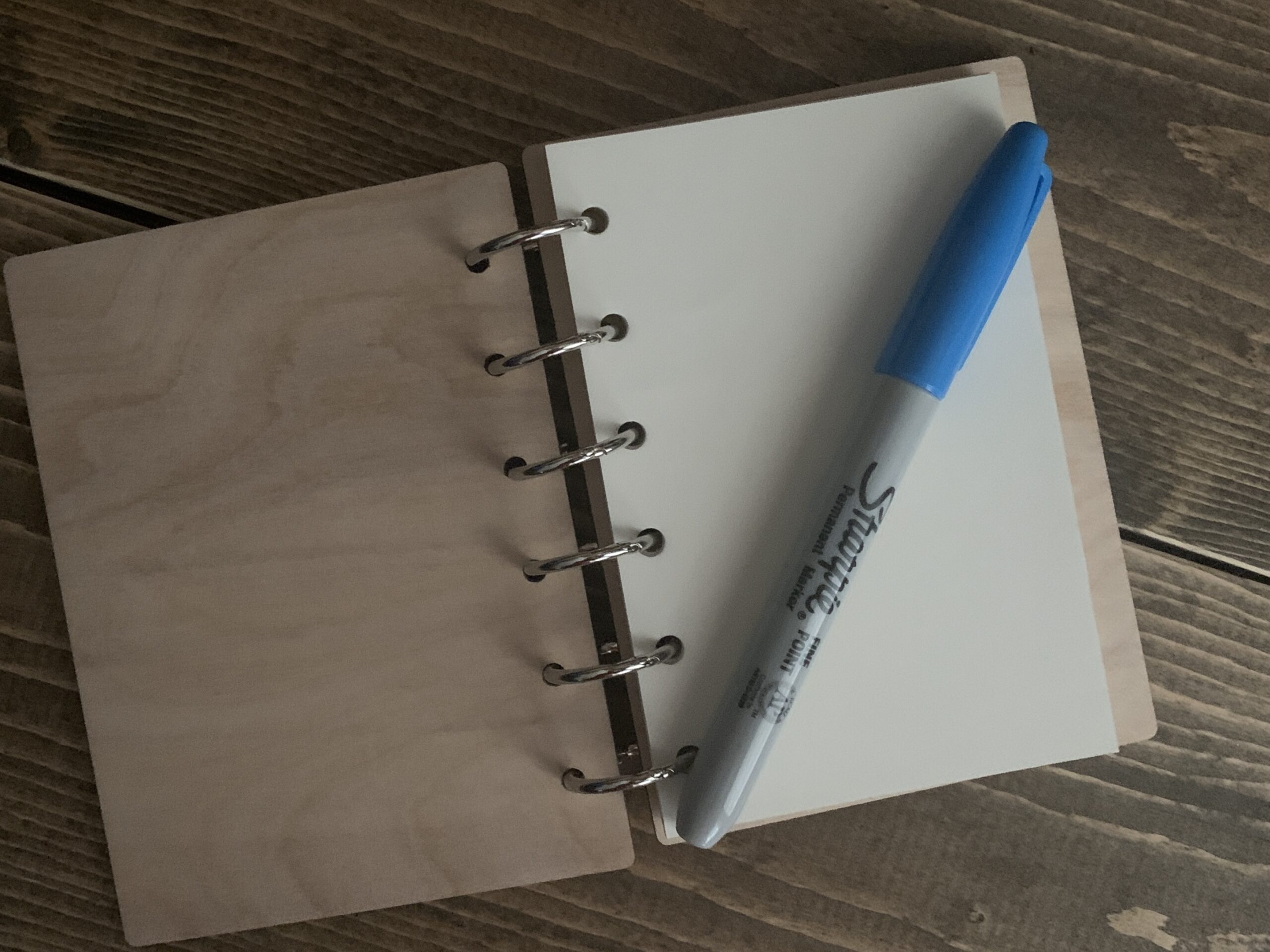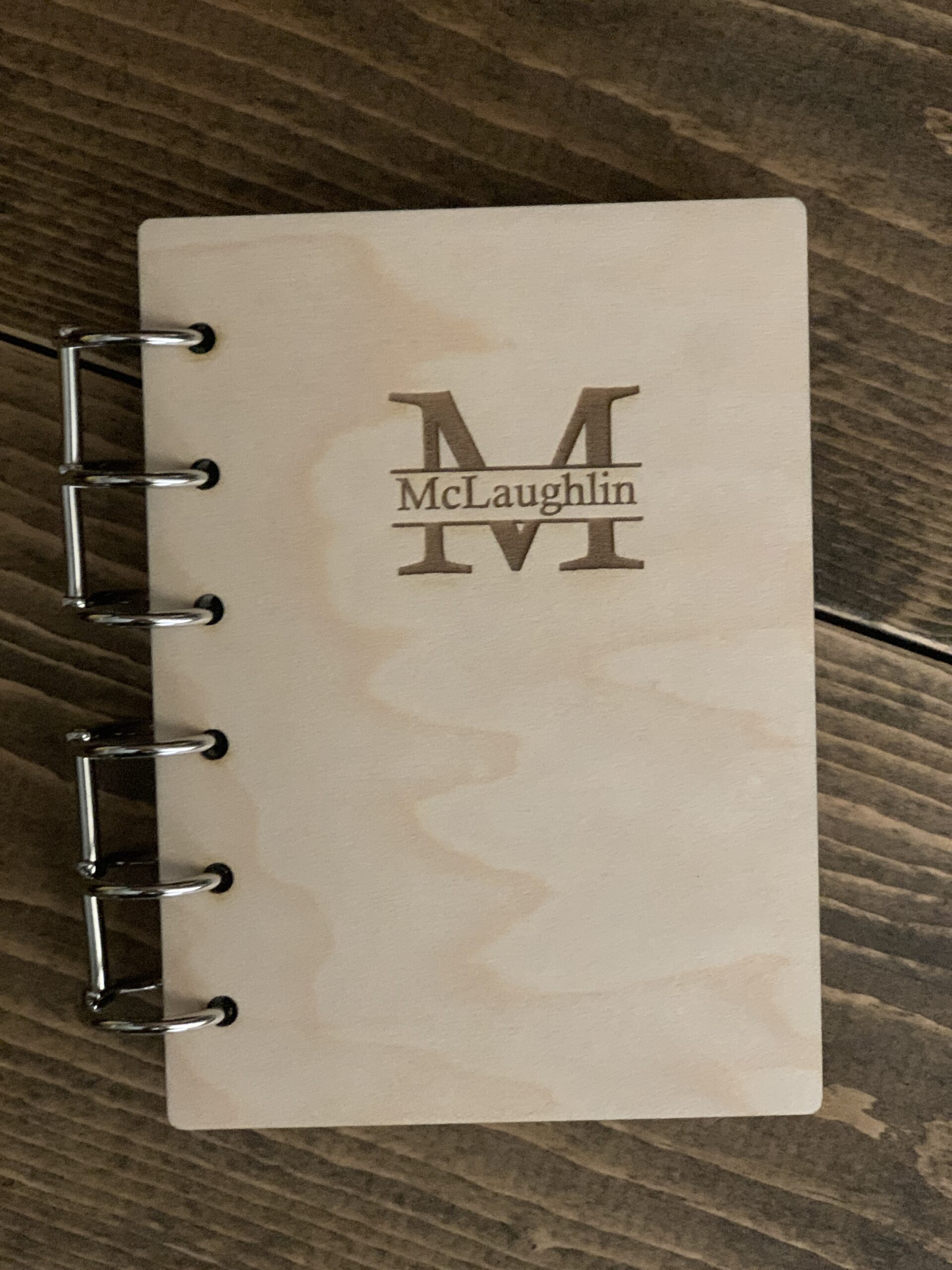 This notebook is is 5.125″ by 3.75″ and can be personalized with a name, birth flower, company name / logo, monogram, etc. The wood is 1/16″ thick.